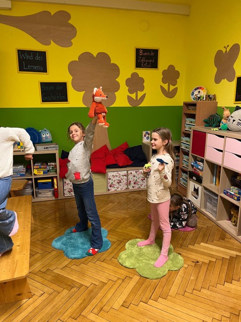 Ob man sich beim „Roboter-Spiel“ gegenseitig steuert, gemeinsam den Teppich, auf dem man steht, umdrehen muss oder sich entknoten muss, ohne aufeinander zu achten und auch zuzuhören geht es bei Singen und Spielen nicht!