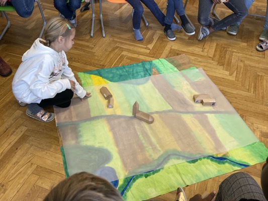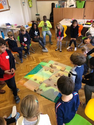 Nachdem sich die Kinder mit den eigenen Bedürfnissen bzw. den Anforderungen an den Lebensraum beschäftigt haben, wurde mit kleinen Holzhäusern ein Ort gebaut, viel diskutiert und ein Plan gezeichnet. Besonderes Augenmerk wurde dabei auf kurze Wege, wenig Bodenverbrauch und den Schutz der Landschaft als Lebensraum für Tiere gelegt.